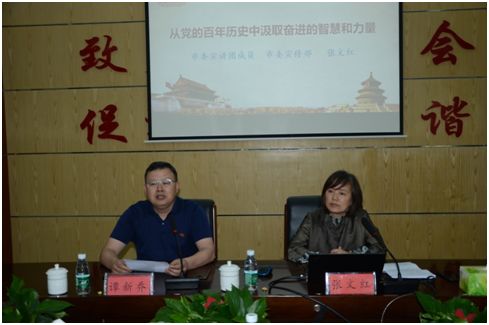 张文红同志正在给在潭党委成员、中层干部、党支部书记作宣讲报告