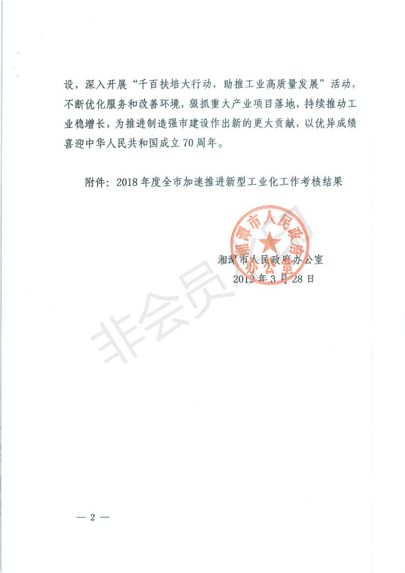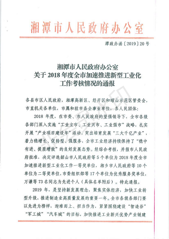 湘潭市人民政府办公室关于2018年度全市加速推进新型工业化工作考核情况的通报