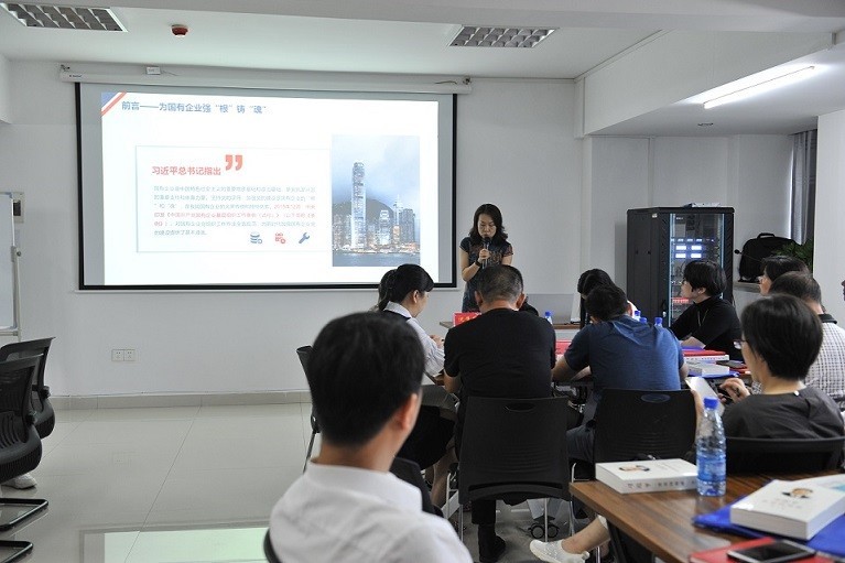图为市国资委党建工作科(人事科)科长沈隽华讲课